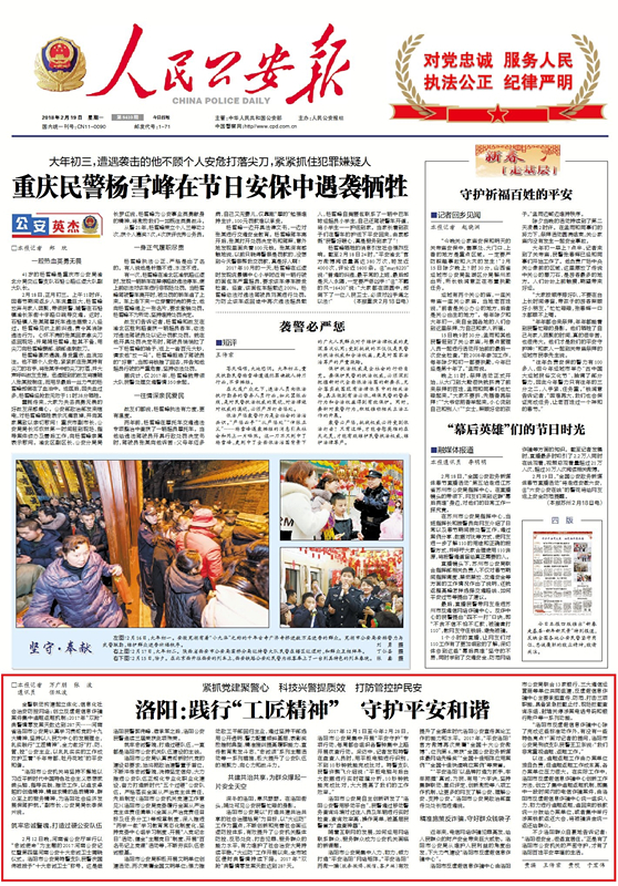 2月26日《人民公安報(bào)》頭版刊登了《洛陽(yáng):踐行“工匠精神” 守護(hù)平安和諧》文章,重點(diǎn)展示洛陽(yáng)市公安局在“大巡防”工作中,如何做到全市城區(qū)侵財(cái)類警情持續(xù)下降。2017年“雙搶”類警情零發(fā)案天數(shù)達(dá)到287天。