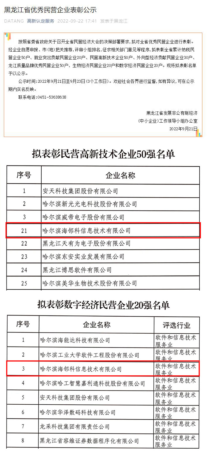 近日,黑龍江省高新認定服務發(fā)布了“黑龍江省優(yōu)秀民營企業(yè)表彰公示”通知,哈爾濱海鄰科公司憑借卓越的創(chuàng)新能力,獲評全省“民營高新技術企業(yè)50強”和“數(shù)字經(jīng)濟民營企業(yè)20強”企業(yè),受到省委、省政府的表彰!
