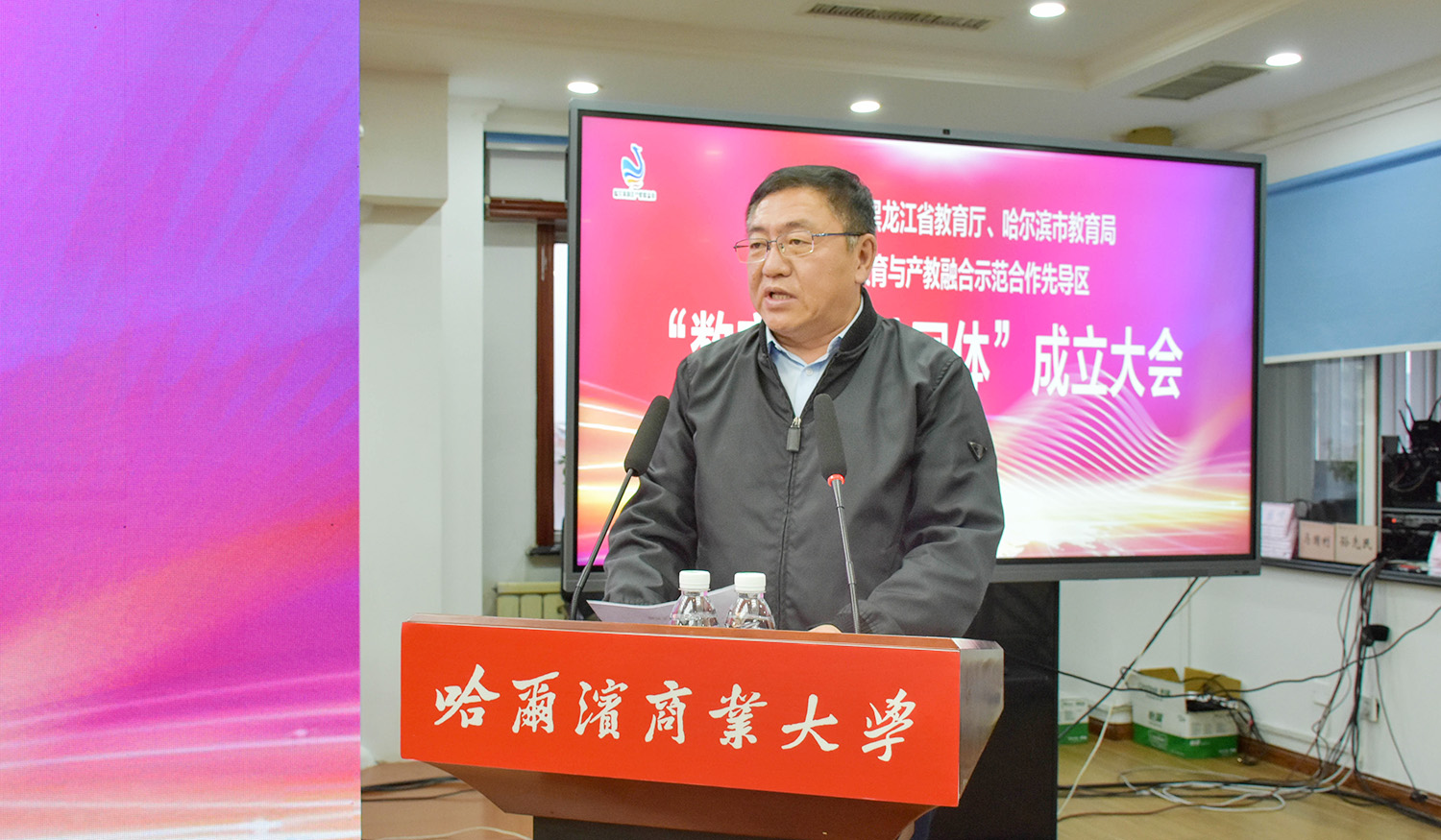 哈爾濱松北區(qū)副區(qū)長(zhǎng)王媛、中國(guó)(黑龍江)自由貿(mào)易試驗(yàn)區(qū)哈爾濱片區(qū)管委會(huì)副主任王凱,哈爾濱商業(yè)大學(xué)校長(zhǎng)鄭秋鹛、副校長(zhǎng)王巍、副校長(zhǎng)趙大偉,松北區(qū)工信局、民社局、教育局、發(fā)改局、商務(wù)局、文旅局及區(qū)委宣傳部,深哈產(chǎn)業(yè)園,海鄰科公司等相關(guān)單位負(fù)責(zé)同志和工作人員出席大會(huì)。