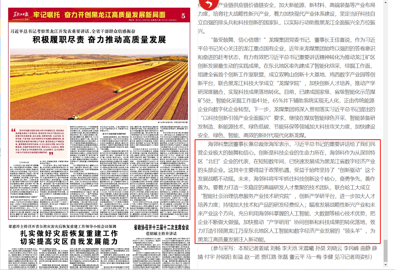 9月9日,《黑龍江日報》第05版報道