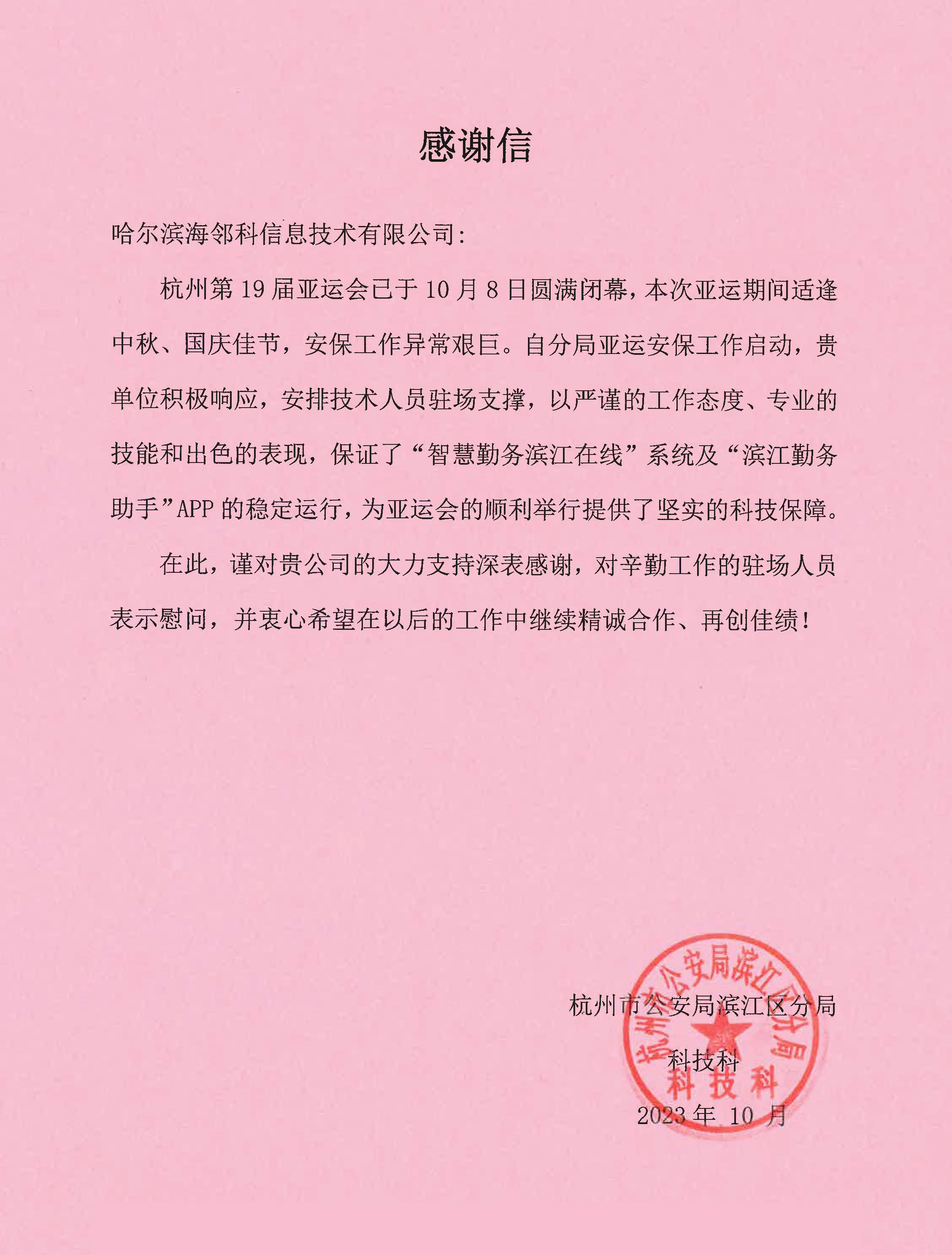 近日,海鄰科集團收到了一封來自杭州市公安局濱江區(qū)分局的感謝信。舉世矚目的第 19 屆亞運會于10月8日圓滿閉幕,亞運會期間,海鄰科項目團隊以出色的專業(yè)技能和優(yōu)異的工作表現(xiàn),獲得了杭州公安的高度肯定和盛贊,展現(xiàn)出海鄰科人精益求精的服務精神和良好的企業(yè)形象。海鄰科為杭州亞運安保交了一份滿意的答卷。