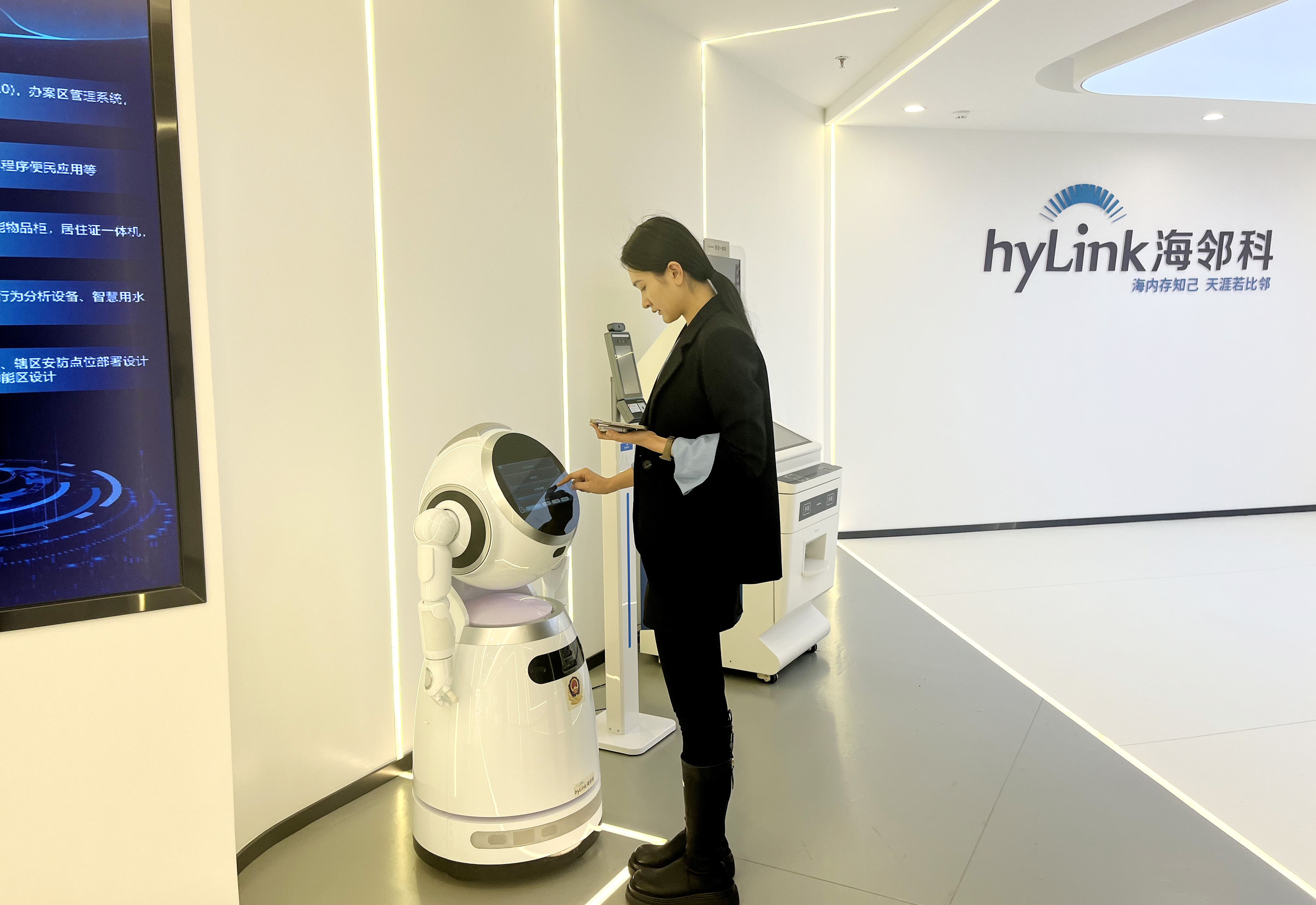 在海鄰科數(shù)字化展廳內(nèi),政務(wù)一體化機(jī)器人、智慧警務(wù)和智慧綜治系統(tǒng)、5G智慧公車系統(tǒng)及裝備、智能消防系統(tǒng)和裝備等一系列軟件系統(tǒng)平臺和智能硬件裝備,展示了海鄰科在基層社會(huì)治理數(shù)字化方面的技術(shù)創(chuàng)新和研發(fā)生產(chǎn)能力。