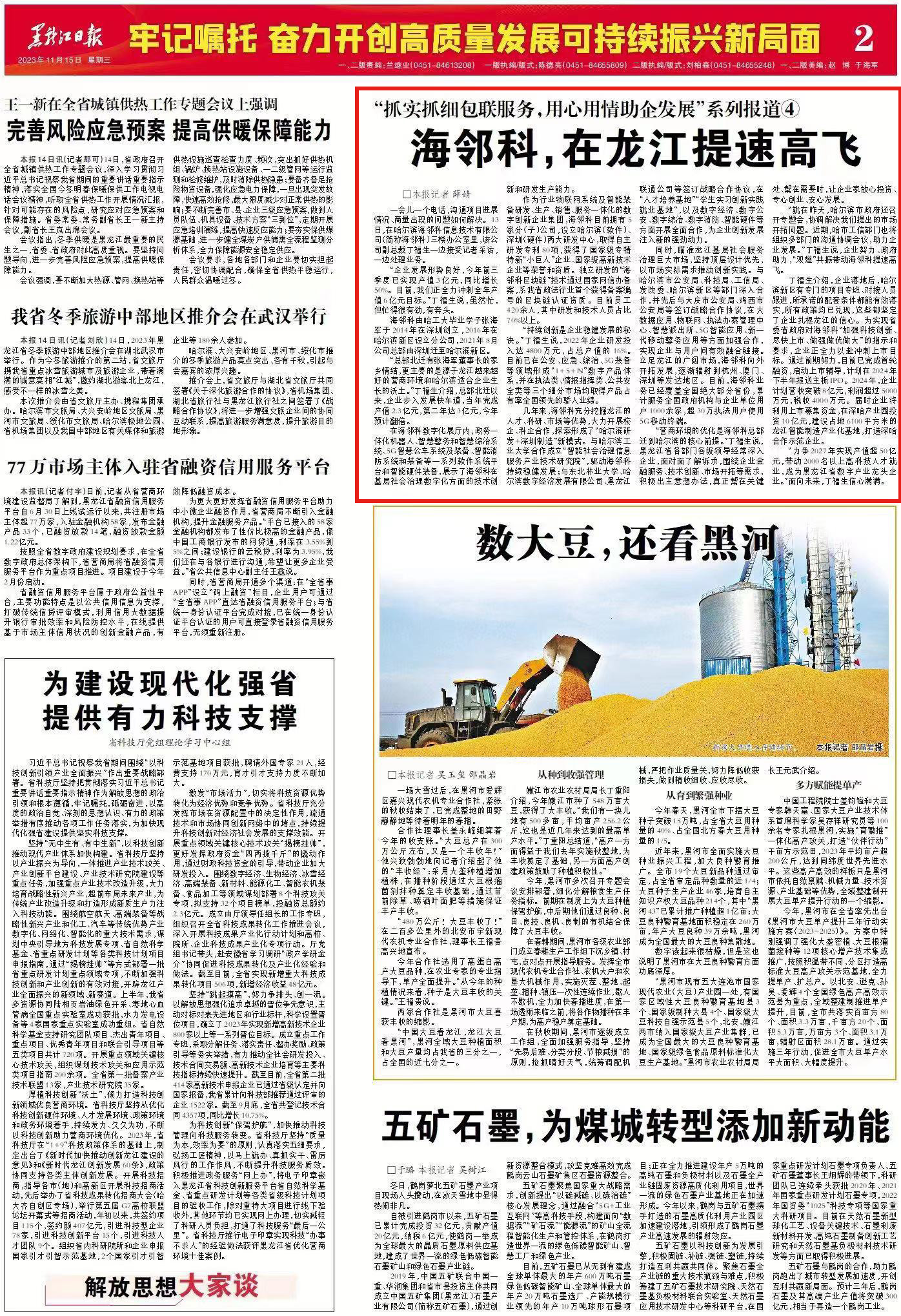 “就在昨天,哈爾濱市政府還召開專題會(huì),協(xié)調(diào)解決我們提出的市場開拓問題。近期,哈市工信部門也將組織多部門的溝通協(xié)調(diào)會(huì)議,助力企業(yè)發(fā)展?!倍「If,企業(yè)努力、政府助力,“雙翅”共振帶動(dòng)海鄰科提速高飛。